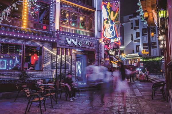 幾年前與化龍井、紅磚民居、小廣場一同完成改造的,是沿街“建新如舊”的40棟仿古商鋪,同業(yè)聚集的主題沒變,商鋪搖身變?yōu)?0家風(fēng)格各異的酒吧,從此,長沙聊清吧文化再也繞不開這條古街。酒吧必然是聲音的制造者,雨聲、腳步聲、鄰里間的高談闊論聲……化龍池原本有很多聲音,此后又多了一種替這座城市記憶、見證的聲音。