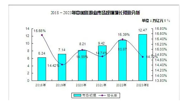 2023年中國(guó)旅游市場(chǎng)高速增長(zhǎng),入出境市場(chǎng)平穩(wěn)發(fā)展,供給側(cè)結(jié)構(gòu)性改革成效明顯。從2012-2017年旅游行業(yè)數(shù)據(jù)來看,全國(guó)旅游收入保持著兩位數(shù)穩(wěn)定增長(zhǎng)。2014年全國(guó)旅游收入達(dá)3.73萬億元,同比增長(zhǎng)25.4%,達(dá)到近幾年來增速峰值,2015年增幅相對(duì)有所放緩。隨著近年來,政府大力發(fā)展全域旅游、冰雪旅游等,2015-2017年中國(guó)旅游業(yè)收入增速不斷提高。2018年全國(guó)旅游收入將達(dá)6.24萬億元,增速約增至15.6%,2023-2028年中國(guó)旅游行業(yè)市場(chǎng)深度研究及發(fā)展前景投資可行性分析報(bào)告預(yù)計(jì)到2023年全國(guó)旅游收入將達(dá)到12.47萬億元 ?