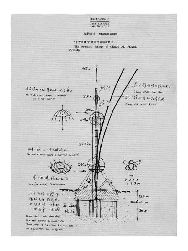 東方明珠廣播電視塔主體為多筒結(jié)構(gòu),由3根斜撐、3根立柱及廣場、塔座、下球體、5個小球體、上球體、太空艙、發(fā)射天線桅桿等構(gòu)成,主體結(jié)構(gòu)高350米,總高468米,總建筑面積達10萬平方米。