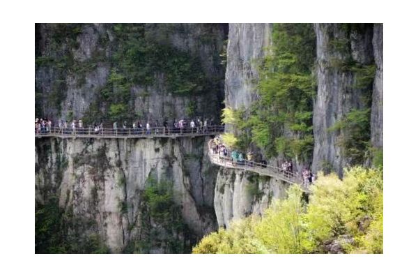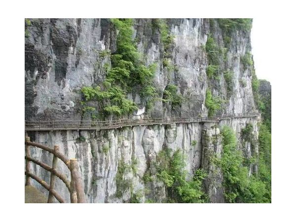 絕壁長廊,又叫“絕壁棧道”,始建于2007年10月,全長488米,118個臺階。位于海拔1700余米、凈高差300余米之絕壁山腰間。該工程既汲取了巴蜀古棧道營造法,又結(jié)合現(xiàn)代鋼筋砼施工之先進(jìn)工藝,科學(xué)安全,凝聚著當(dāng)代開發(fā)創(chuàng)業(yè)者的勇氣與智慧。沿棧道游覽,一路可以欣賞武陵風(fēng)光。該棧道共有七道彎八道拐,寓意是:路七彎八拐,心始終如一。歌曰:北斗七星有七斗(dǒu),絕壁棧道有七抖(dǒu);經(jīng)過一番驚嚇后,人生道路手拉手。