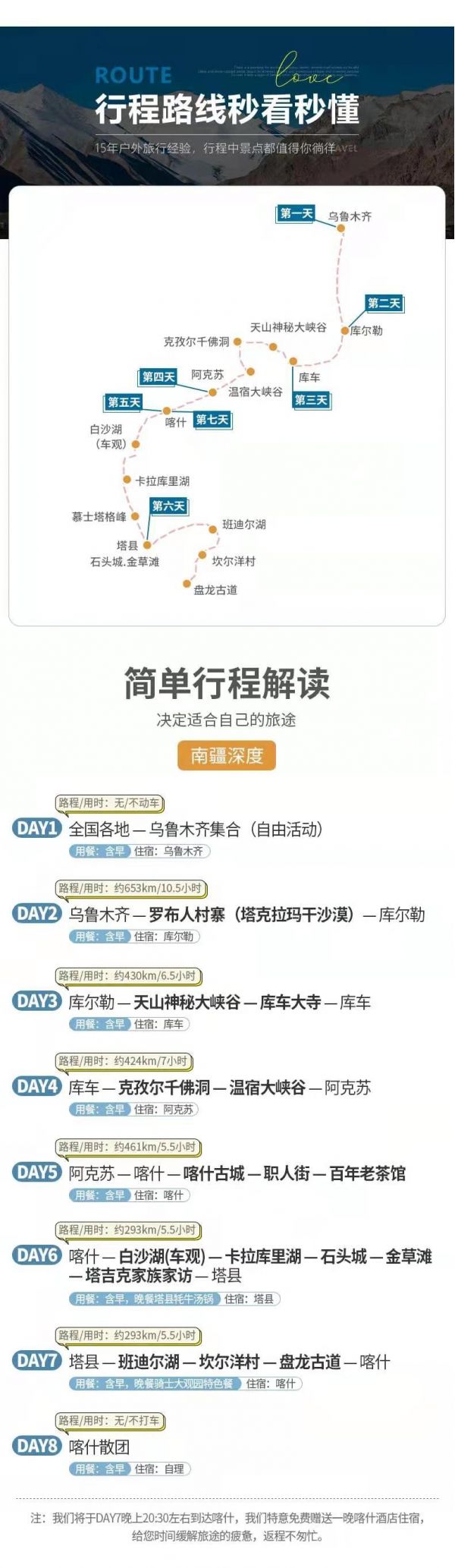 當(dāng)天車程較長,從北疆穿越天山甘溝進(jìn)入南疆腹地,氣候變化較大,請適當(dāng)增減衣物,注意補(bǔ)充水分??商崆百徺I一些零食,以備不時之需。