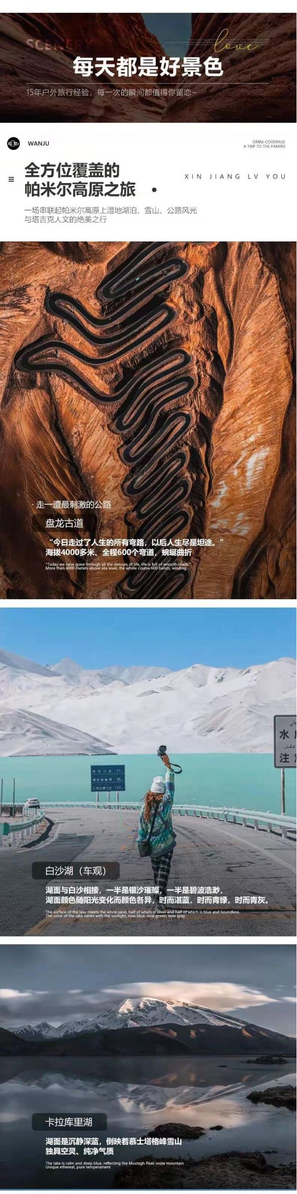 告別“東方摩洛哥”—喀什,我們將開啟一段帕米爾高原之旅。沿314國道一路暢游帕米爾高原風(fēng)光,首先驚艷我們的是背靠白色沙丘和雪山的【白沙湖】,在陽光的變化下,湖水時而呈湛藍(lán)色,時而呈綠色。更令人驚嘆的是,藍(lán)色的湖面與白沙相接,一半藍(lán)一半白,而白沙背后還有雪山。在雪山和白沙的映襯之下,白沙湖水更顯澄澈。在這里能get湖泊、白沙、雪山同框的畫面。分享一個冷知識:白沙湖又名流沙河,就是西游記里唐僧收服沙和尚的地方。我們還能途觀慕士塔格峰,山頂常年皚皚白雪,猶如滿頭白發(fā),十余條冰川鑲嵌在峰體下的峽谷中,如胸前飄動的銀須,故有“冰山之父”的美稱。隨后我們將遇見【卡拉庫里湖】,這里能看到雪山倒映在湖面的風(fēng)景,拍出來的照片特別的給人純凈的感覺。
