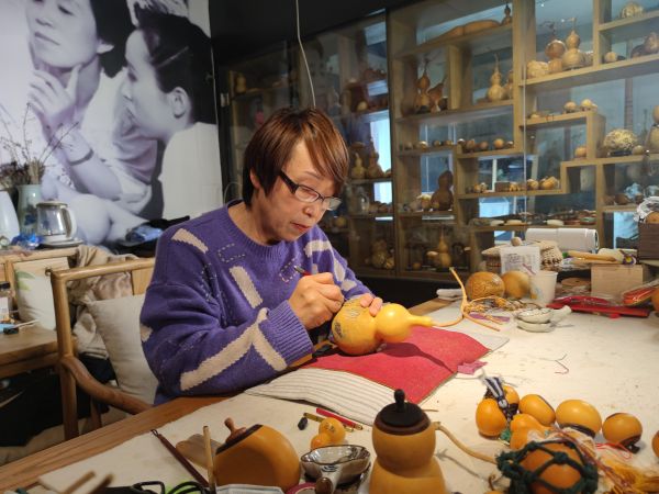 如今,阮琳已將工作重心放在了蘭州刻葫蘆非物質(zhì)文化遺產(chǎn)的保護和傳播上。她要么參加各種文化方面的交流培訓會議,向更多人介紹蘭州刻葫蘆;要么在傳習所為游客講解刻葫蘆技藝和文化,指點客人自制一件刻葫蘆作品。