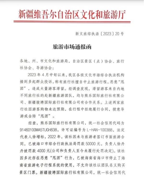 5月11日,新疆維吾爾自治區(qū)文化和旅游廳文化市場綜合執(zhí)法監(jiān)督局發(fā)布通報,熊樂國際旅行社有限公司、新疆駿騁國際旅行社有限公司接待內(nèi)地旅行社赴新疆旅游團(tuán)隊的過程中,因游客購物未達(dá)預(yù)期,在行程中拒絕履行合同,授意導(dǎo)游或全陪“甩團(tuán)”,已被多次投訴。