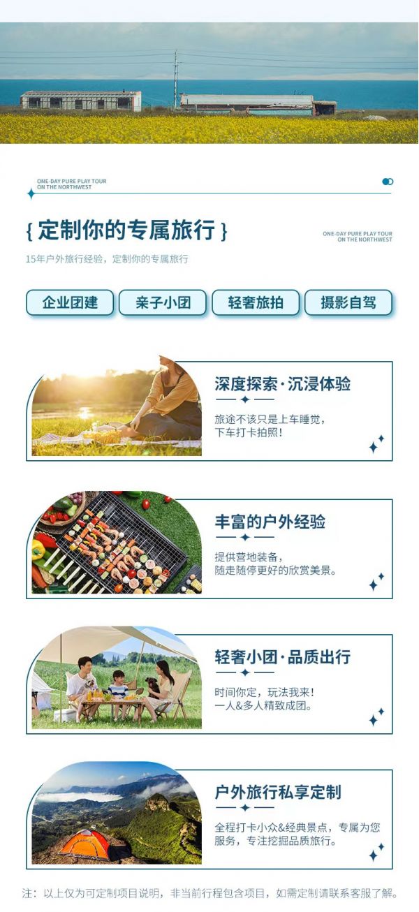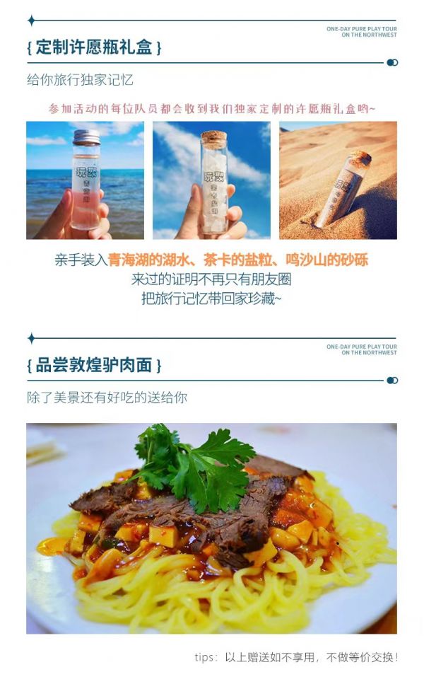 請對應使用我方玩聚甘青夢境小團7日行程,因使用其它行程造成的投訴,責任自負;請仔細閱讀以上行程文檔,同意并保證遵守我方安排,以免為您帶來不必要的麻煩;如產(chǎn)生合同糾紛或人身意外事故,按《中華人民共和國合同法》、《道路交通法》、《保險賠償條例》裁定;本行程作為旅游合同附頁與旅游合同同等法律效力。