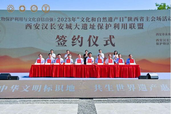 為深入探索漢長安城遺址保護(hù)利用新路徑,漢長安城特區(qū)管委會與陜西省高等院校、科研院所攜手成立“大遺址保護(hù)利用聯(lián)盟”,并在現(xiàn)場舉辦了簽約儀式,旨在圍繞文化傳承、科學(xué)研究、人才培養(yǎng)、社會服務(wù)等建立長期、深入的戰(zhàn)略合作關(guān)系?;顒蝇F(xiàn)場,還舉辦了第三屆“最美陜西文物安全守護(hù)人”表彰儀式、“陜西省考古地質(zhì)研究中心”授牌儀式,公布了沿黃文化主題游徑、中共中央轉(zhuǎn)戰(zhàn)陜北主題游徑和大漢文化主題游徑等陜西省首批文物主題游徑。