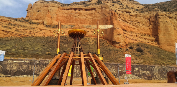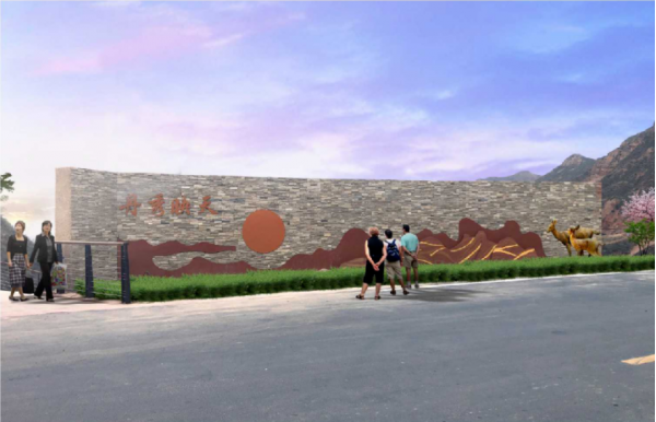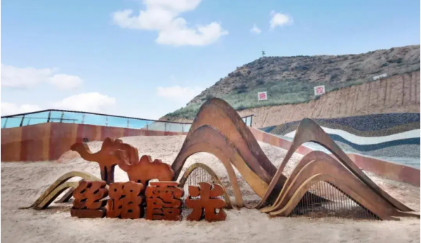 井部落文化廣場以當?shù)爻鐾恋纳尘幕拍惯z址為文化線索,結(jié)合現(xiàn)有的鷹巖崖壁景觀和山谷平地,以出土“鷹”首杖的“鷹”為圖騰元素,規(guī)劃“鷹巖祭天”活動場景。這里的摩崖石刻藝術(shù)地展現(xiàn)了古絲綢之路的繁華盛況,可以讓人穿越時空,回味沙井文化歷史。