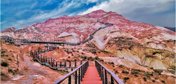 “雄鷹探海,雙翼齊飛”絲路雄鷹觀景平臺海拔1841米,是景區(qū)內(nèi)第一個近距離俯瞰丹霞地貌的觀景點。此處丹霞崖壁壯觀雄渾,紅山灣地貌色彩斑斕,猶如跌落人間的彩虹。既可俯瞰全貌,又可深入彩色山嵐,近觀微型石林之妙,遠賞南北兩側(cè)地質(zhì)差異奇觀,是游客近距離接觸丹霞地質(zhì)遺跡的最佳地點。