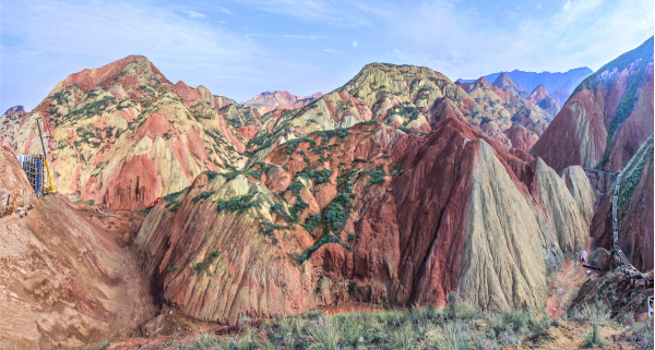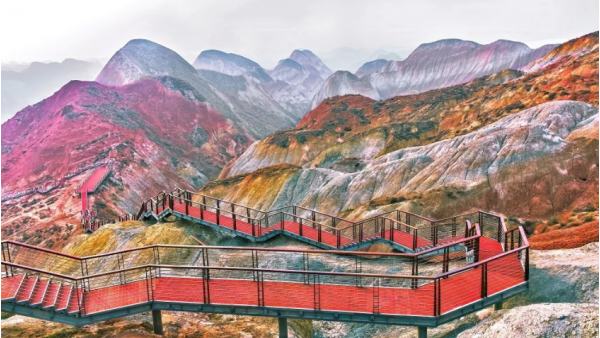 翠峰瀾天觀景平臺位于丹霞道中部,其具有觀光、休憩功能,此處為丹霞地貌的一個分水嶺,可以看到兩種不同的場景,左側(cè)山頭翠綠的碧色與右側(cè)彩色的山丘形成鮮明的對比。