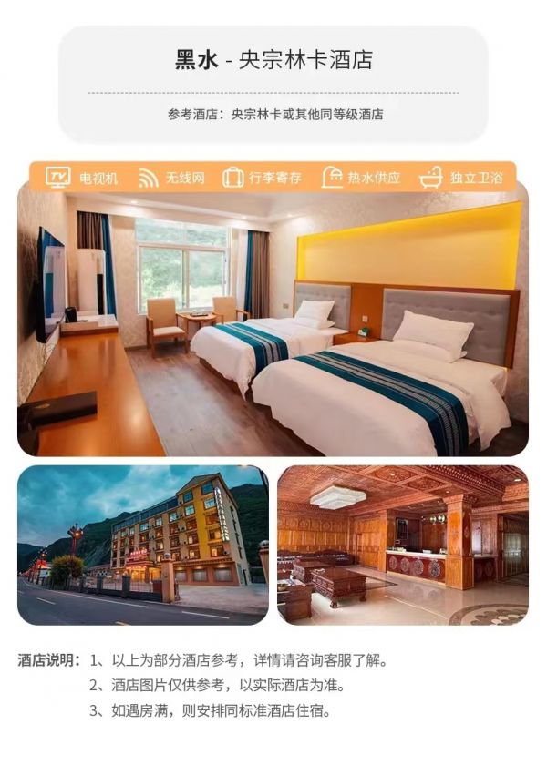住宿:川主寺鎮(zhèn)酒店標間說明”早餐后從黑水縣出發(fā),前往“人間瑤池”【黃龍風(fēng)景區(qū)】游覽(索道上行80元/人、下行40元/人,費用自理,建議乘坐),這是一個以奇幻美麗的鈣化池聞名于世的景區(qū),景區(qū)內(nèi)眾多的鈣化池池水清澈見底,五光十色非常漂亮,還有森林、峽谷、雪山、瀑布等眾多的自然風(fēng)光,被稱為“人間瑤池”。以彩池、雪山、峽谷、森林“四絕”著稱于世,加上灘流、古寺、民俗稱為“七絕”。游覽后前往川主寺鎮(zhèn)入住。