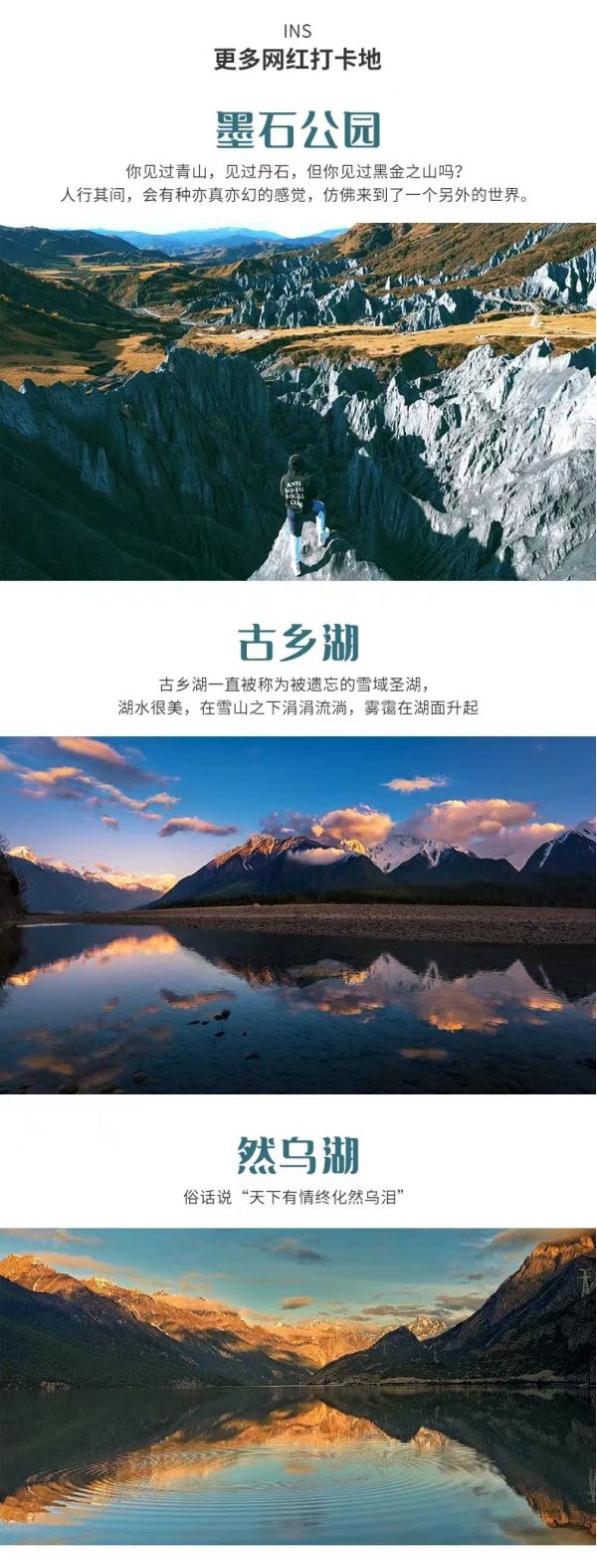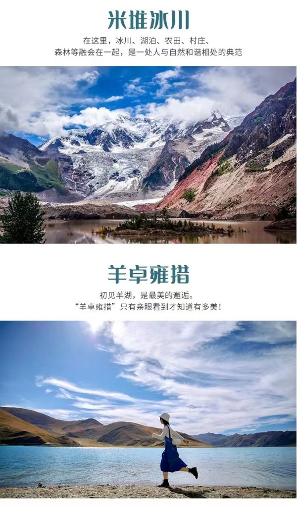 四姑娘山雙橋溝.墨石公園.魚(yú)子西.塔公草原.天路十八彎.理塘.稻城亞丁.怒江72拐.然烏湖.米堆冰川.古鄉(xiāng)湖.色季拉山口.羊卓雍措.拉薩