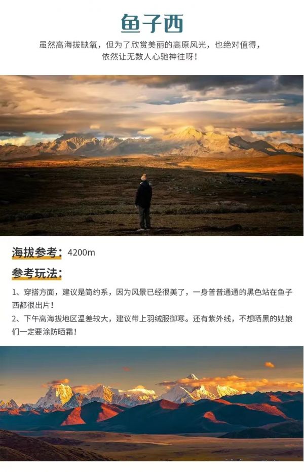 溫馨提示:(1)冬季11月-次年3月如因魚(yú)子西/格底拉姆封山無(wú)法前往,則將魚(yú)子西/格底拉姆景點(diǎn)換為八郎生都。