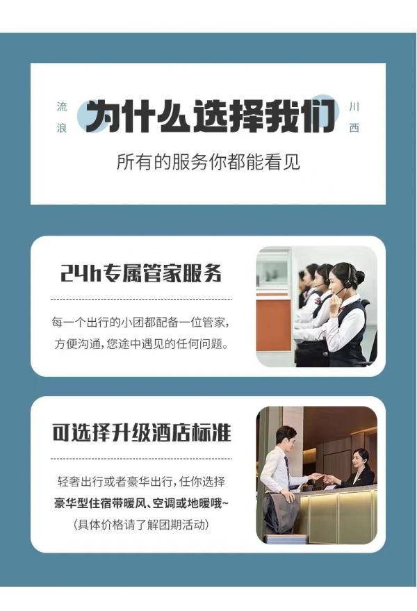 私人訂制:我們業(yè)務(wù)范圍囊括了全國(guó)各大城市,川西、西北、新疆、西藏,在路上永遠(yuǎn)有我們的身影。我們將為每一個(gè)有定制需求的你策劃出獨(dú)屬于自己的完美旅行。