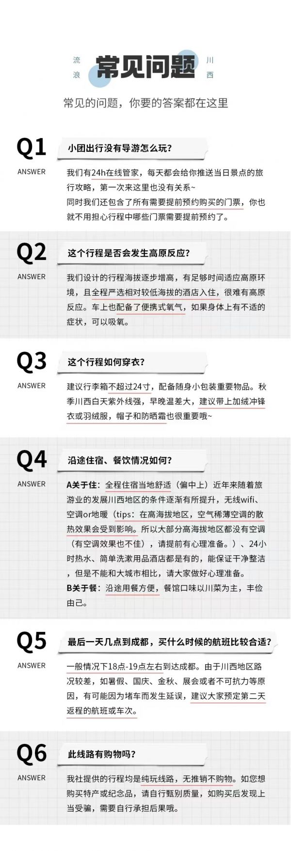 海拔說(shuō)明:3630-4200-4260-4000-2560-540m隨預(yù)計(jì)晚上19:00 成都上車(chē)點(diǎn)散團(tuán),結(jié)束愉快的5天旅程。