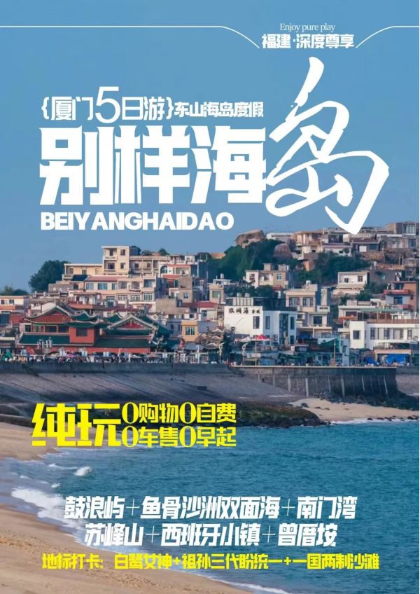廈門、夜宿鼓浪嶼、旅拍鼓浪嶼、東山島魚(yú)骨沙洲雙面海、西班牙卡達(dá)凱斯小鎮(zhèn)深度游雙飛五日(行程供參考,導(dǎo)游在不減少景點(diǎn)的情況下會(huì)根據(jù)實(shí)際情況相應(yīng)調(diào)整游覽順序)