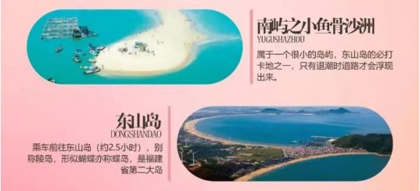 魚(yú)骨沙洲·快艇出海:前往【魚(yú)骨沙洲雙面?!繉儆谝粋€(gè)很小的島嶼,東山島的必打卡地之一,只有退潮時(shí)道路才會(huì)浮現(xiàn)出來(lái)。建議下午的時(shí)候去,千萬(wàn)要注意漲潮時(shí)間喔。島嶼上有一座燈塔(是電影《你的婚禮》里面出鏡的那座喔),如果你站在燈塔旁邊的礁石上,你就會(huì)發(fā)現(xiàn)在距離不遠(yuǎn)處還有一座燈塔。兩座燈塔隔海相望,仿佛就像是一對(duì)戀人,彼此相守,而大陸就是他們的孩子。致力打造東山島必去網(wǎng)紅打卡地?...