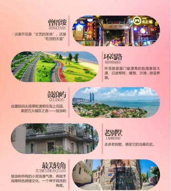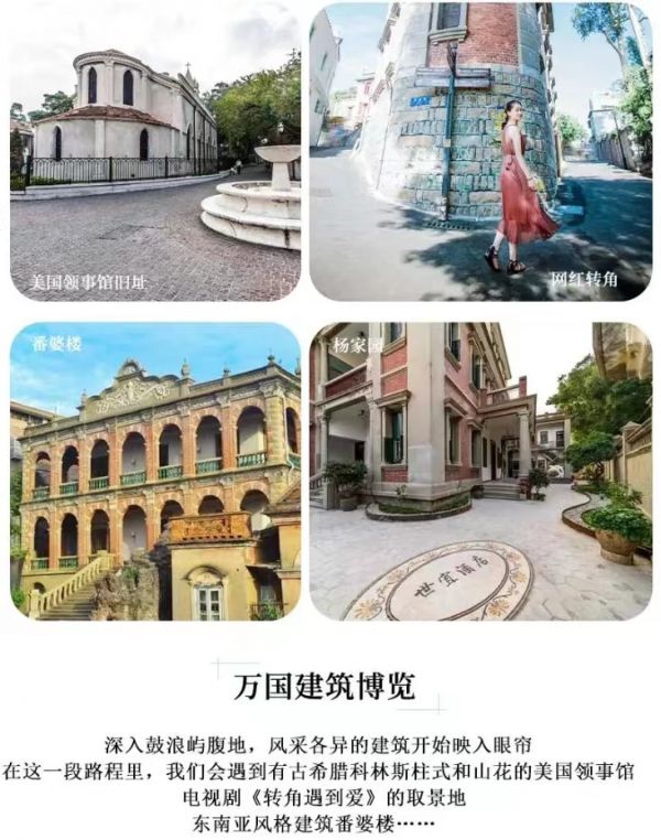 網(wǎng)紅打卡拍照點(diǎn):①「最美轉(zhuǎn)角」②「曉學(xué)堂·蟲(chóng)洞書店」③「協(xié)和禮拜堂」④「天主教堂-萬(wàn)國(guó)領(lǐng)事館建筑博覽」⑤「怡園-林鶴年故居」