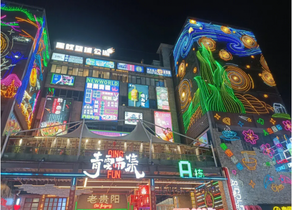 結(jié)合了游玩、餐飲美食、潮流文創(chuàng)、休閑娛樂、運(yùn)動體驗(yàn)等豐全方位豐富多彩的“網(wǎng)紅街”。特別是滿街燈光渲染的文藝設(shè)計(jì)和文字圖案,構(gòu)成了這個(gè)號稱貴陽最適合打卡拍照、游玩、品美食的休閑好去處。