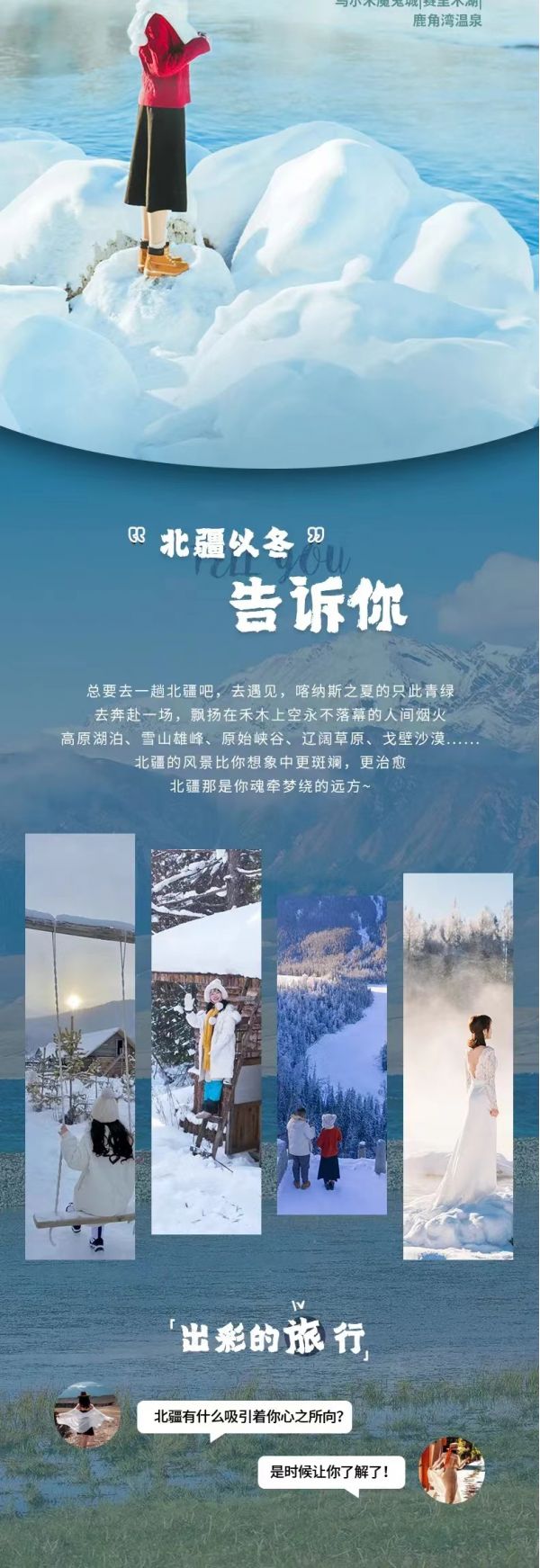 早起趁著天色未亮,裹件皮大衣登上哈根平臺(tái),搓著手,跺著腳等待禾木冬季的日出,當(dāng)火紅的圓形緩緩出現(xiàn)在地平線的時(shí)候,腳下是炊煙裊裊正慢慢蘇醒的村落,被慢慢照亮,如果沒有太陽的色彩,眼前就像一幅靜止的水墨畫,只是人在畫中。在零下三十?dāng)z氏度的戶外,看當(dāng)?shù)厝说鹧?,車?yán)?,滑野雪,撒水成冰,圍觀古老的毛皮滑雪比賽,住進(jìn)外古內(nèi)新的木頭房,看馬拉爬犁在圖瓦人的木屋間穿梭,聽歡歌笑語在親朋好友間傳送,感受圖瓦人有趣歡樂的氛圍。然后前往【世界魔鬼城】在這里可以欣賞到千奇百怪的雅丹地貌,遠(yuǎn)眺風(fēng)城,宛若中世紀(jì)的一座古城堡,但見堡群林立,大小相間,高矮參差,錯(cuò)落重迭,給人以凄森蒼涼恐怖之感。