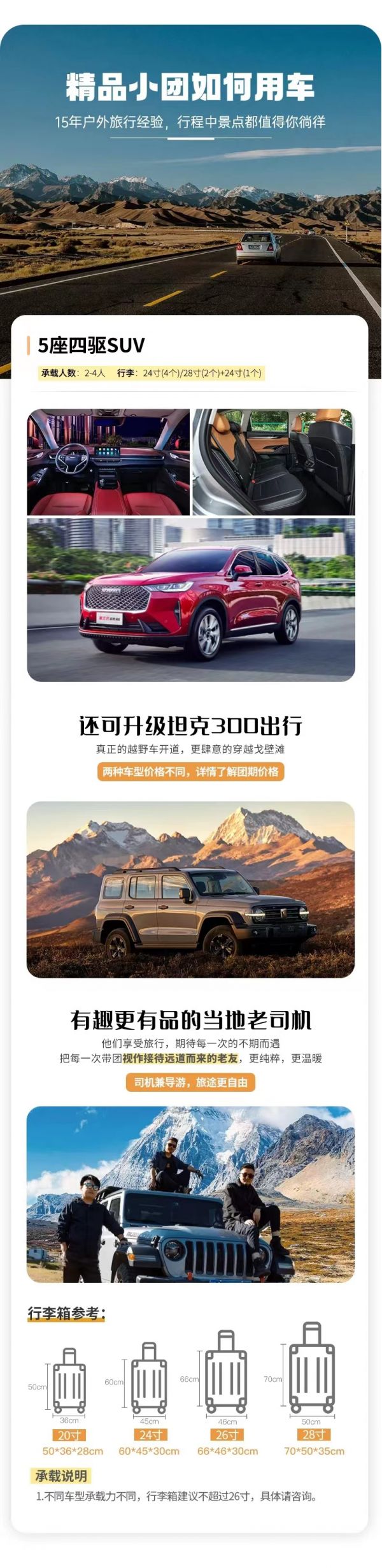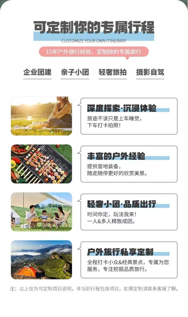私人訂制:我們業(yè)務(wù)范圍囊括了全國各大城市,川西、西北、新疆、西藏,在路上永遠(yuǎn)有我們的身影。我們將為每一個(gè)有定制需求的你策劃出獨(dú)屬于自己的完美旅行。