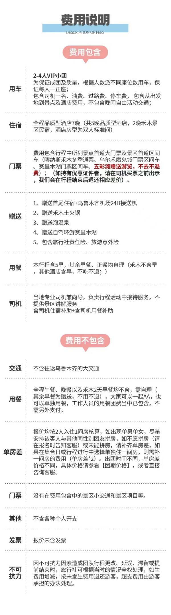 (1)凡有傳染性疾病、心血管疾病、腦血管疾病、呼吸系統(tǒng)疾病、精神病、嚴(yán)重貧血病、大中型手術(shù)的恢復(fù)期病患者、行動(dòng)不便者、孕婦等,以及其他不適合出行者,請(qǐng)不要報(bào)名。代他人報(bào)名者也請(qǐng)核實(shí)代報(bào)人的身體狀況。如果報(bào)名者或者代他人報(bào)名者隱瞞身體狀況,造成的后果,由自己承擔(dān);第8天離團(tuán):(已消費(fèi),所有費(fèi)用不退。)