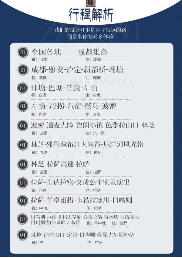 成都—雅安瀘定—新都橋--理塘-巴塘—芒康—左貢--72拐--八宿—然烏—波密--通麥天險--魯朗小鎮(zhèn)--色季拉山口--喬穆永青--奇林峽--定結(jié)濕地--日瑪那雪山--珠峰大本營--林芝-雅魯藏布大峽谷--尼洋河風光帶--林拉高速--拉薩-布達拉--宮羊卓雍措--卡若拉冰川--日喀則--拉孜--孔瑪大草原