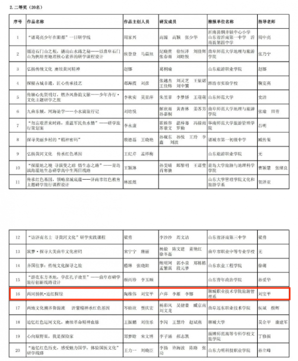 由山東省總工會(huì)、山東省文化和旅游廳、山東省新舊動(dòng)能轉(zhuǎn)換綜合試驗(yàn)區(qū)建設(shè)辦公室、山東省人力資源和社會(huì)保障廳、山東省教育廳、山東省農(nóng)業(yè)農(nóng)村廳、山東省精品旅游促進(jìn)會(huì)共同主辦,山東省精品旅游促進(jìn)會(huì)組織實(shí)施的“2023第四屆山東省研學(xué)旅行創(chuàng)新線(xiàn)路設(shè)計(jì)大賽暨首屆山東省研學(xué)旅行指導(dǎo)師技能大賽”的評(píng)審工作,嚴(yán)格按照統(tǒng)一報(bào)名參賽、網(wǎng)絡(luò)投票、專(zhuān)家評(píng)審、組委會(huì)審核等程序,研究確定了獲獎(jiǎng)名單。聊城職業(yè)技術(shù)學(xué)院旅游管理系師生工作室團(tuán)隊(duì)不負(fù)眾望,喜獲“2023第四屆山東省研學(xué)旅行創(chuàng)新線(xiàn)路設(shè)計(jì)大賽”二等獎(jiǎng)。