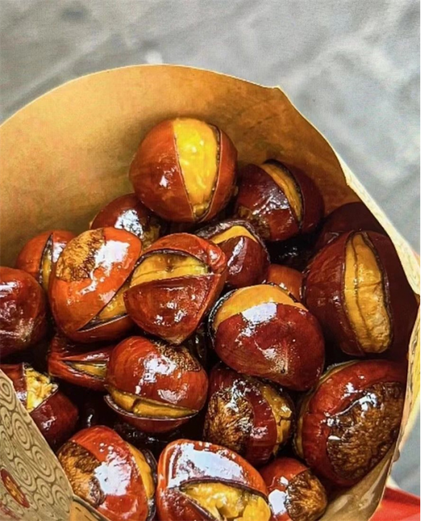 最近沒事在街上溜達(dá)的時候,頻頻被她吸引目光。是的沒錯,一鍋鍋褐色板栗總是在有意無意地散發(fā)香味,剛出鍋的糖炒栗子渾身散發(fā)著溫暖的熱氣,油潤的外殼直冒焦香,連口中呼出的熱氣都帶著栗子的香氣。