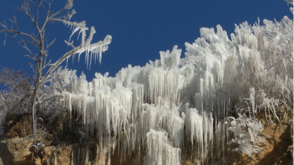 這是他第一次欣賞濰坊冬日的山水風(fēng)景。雪花被樹枝上的水珠凍結(jié),森林樹木變成一片白色,平日里流水潺潺的瀑布凝結(jié)成晶瑩剔透的冰瀑群,這些別具特色的冰雪奇觀,十分震撼。
