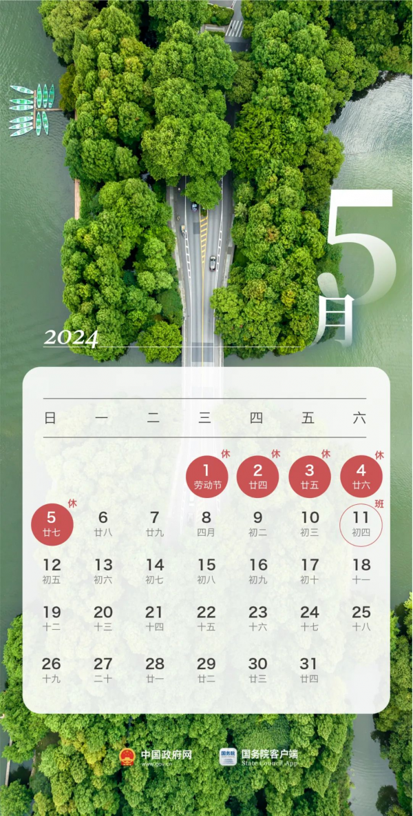 四、勞動(dòng)節(jié):5月1日至5日放假調(diào)休,共5天。4月28日(星期日)、5月11日(星期六)上班。