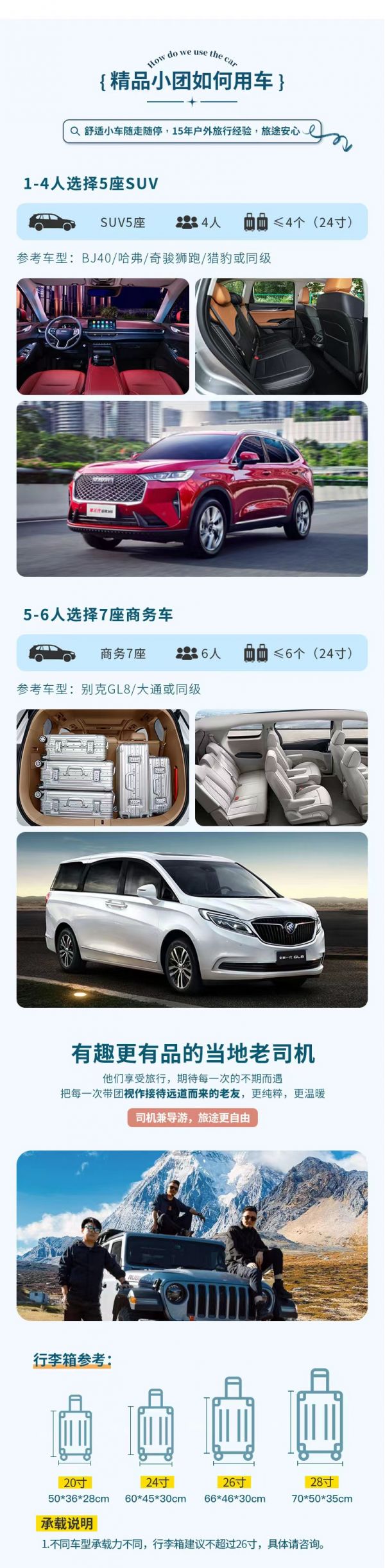 交通:2-8人VIP私享小團(tuán),全程舒適商務(wù)車出行,車型大小根據(jù)實(shí)際人數(shù)安排,保證一人一正座位,且由駕駛經(jīng)驗(yàn)豐富的司機(jī)為您的出行保駕護(hù)航,報(bào)價(jià)包含車費(fèi)、油費(fèi)、停車費(fèi)、維修費(fèi)及司機(jī)勞務(wù)費(fèi)。