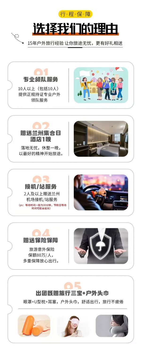接機(jī)/站服務(wù):2人及以上免費(fèi)提供蘭州市區(qū)拼車接火車服務(wù),接火車的工作人員會(huì)在您出發(fā)日期前一天21:30之前向您推送消息并與您聯(lián)系,如果超過時(shí)間沒有接到任何通知,請(qǐng)及時(shí)與領(lǐng)隊(duì)或報(bào)名處聯(lián)系。(節(jié)假日用車人數(shù)較多情況下客人等待時(shí)間可能會(huì)延長(zhǎng);我方會(huì)安排臨近航班拼車接站,如遇其他客人航班火車延誤晚點(diǎn)情況,等待時(shí)間可能會(huì)延長(zhǎng),敬請(qǐng)諒解)