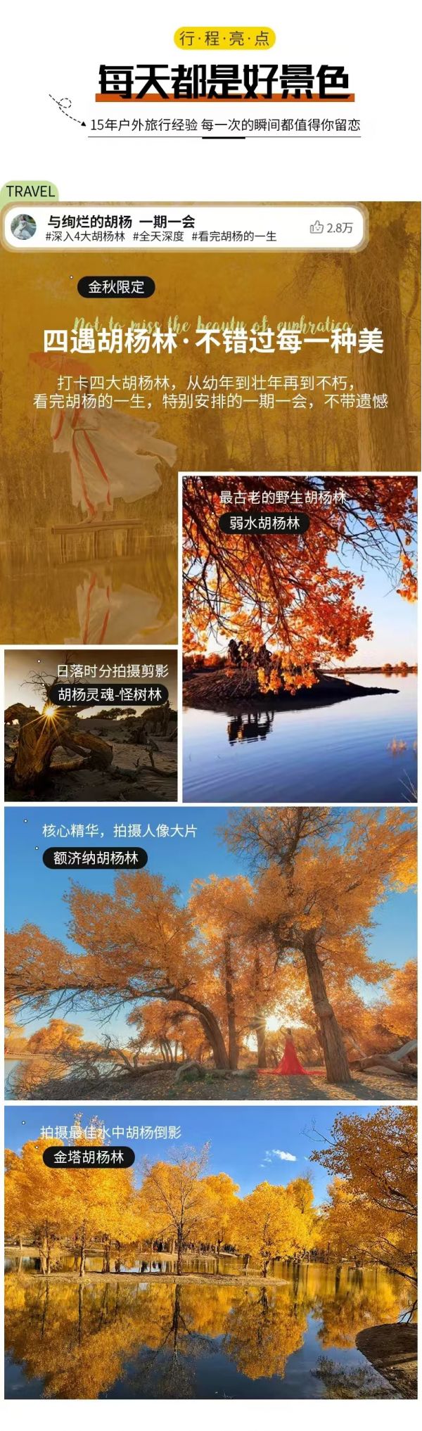 在【額濟(jì)納胡楊林景區(qū)】自由游玩攝影創(chuàng)作,從一道橋到八道橋,去收獲這38萬畝胡楊林的一片金黃浪漫。