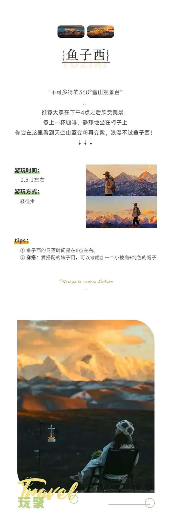 3、在魚子西看日落時,氣溫會比較低,要帶上足夠的保暖衣物。同時,由于海拔較高,要注意預(yù)防高反,避免劇烈運動。