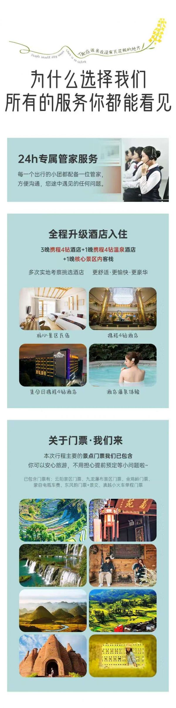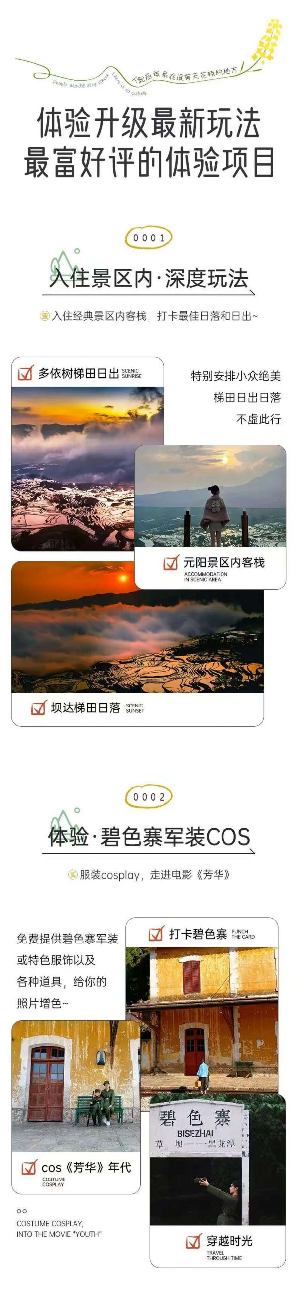 早餐后出發(fā)約半個(gè)多小時(shí)到達(dá)【螺絲田】油菜花,這里的油菜花田呈現(xiàn)出螺絲狀的梯田,與元陽(yáng)的梯田形成鮮明的對(duì)比,讓你不得不感嘆勞動(dòng)人民才是真正的藝術(shù)家,隨著太陽(yáng)慢慢升起,梯田中的云霧也開始慢慢散開,飄飄欲仙,美如仙境。午后游覽【九龍瀑布景區(qū)】,這里是熱門影視《慶余年》等拍攝地。是中國(guó)六大最美瀑布之一的九龍瀑布群。在約兩公里長(zhǎng)的河道上有十級(jí)瀑布,九龍十瀑之間,以淺灘或深潭相連,形成了一串輝映太陽(yáng)光芒的明珠彩帶。邊登高看景邊拍照,渴了買根當(dāng)?shù)爻雒乃}卜,汁多美味,清甜潤(rùn)喉,一路到九龍瀑頂端,那里的油菜花也非常好!