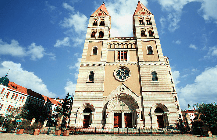 早7:00集合出發(fā),預(yù)計(jì)12:00到達(dá)青島天主教堂。后自由游覽,預(yù)計(jì)時(shí)間1小時(shí)。教堂以黃色花青島天主教堂崗巖和鋼筋混凝土砌成,表面雕以簡潔優(yōu)美的紋案。窗戶為半圓拱形,線條流暢,顯得莊重而樸素。大門上方設(shè)一巨大玫瑰窗,兩側(cè)各聳立一座鐘塔,塔身高56米,紅瓦覆蓋的錐形塔尖上各豎立一個(gè)4.5米高的巨大十字架,塔內(nèi)懸有四口大鐘,一旦鐘樂鳴奏,聲傳數(shù)里之外。