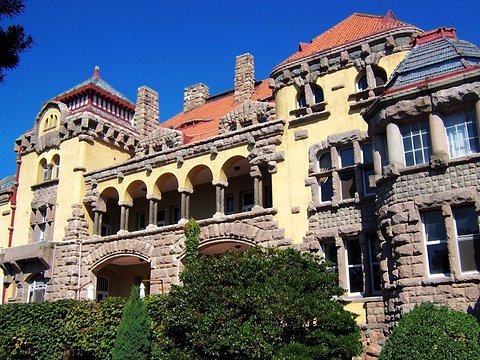 青島迎賓館(青島德國總督官邸舊址博物館)位于繁華商業(yè)區(qū)、風(fēng)景區(qū)的中部。背山面海,雄偉壯觀,它是一座歐式風(fēng)格建筑精華的薈萃,始建于1905年,建成于1907年,是當(dāng)時(shí)膠澳總督的官邸。建筑位于信號山半山腰上,地理位置優(yōu)越,環(huán)境幽雅。建筑設(shè)計(jì)師為德國人拉查魯維茨,建筑總監(jiān)為施特拉塞爾,工程耗資為四十五萬金馬克。建筑面積四千余平方米,主體高三十余米。部分外墻飾以花崗巖作裝飾,石料加工粗樸。米紅色筒瓦、藍(lán)色魚鱗瓦、綠色牛舌瓦鋪設(shè)樓頂,使大樓更加精美別致。建筑主體為四層,共有大小房間30個(gè),其中主要展廳14個(gè)。各個(gè)展廳互相貫通,卻又各成一體,更令人稱奇的是,每個(gè)展廳又三個(gè)不同之處,其內(nèi)部裝飾之豪華、造型之典雅,居我國單體建筑之首列 。