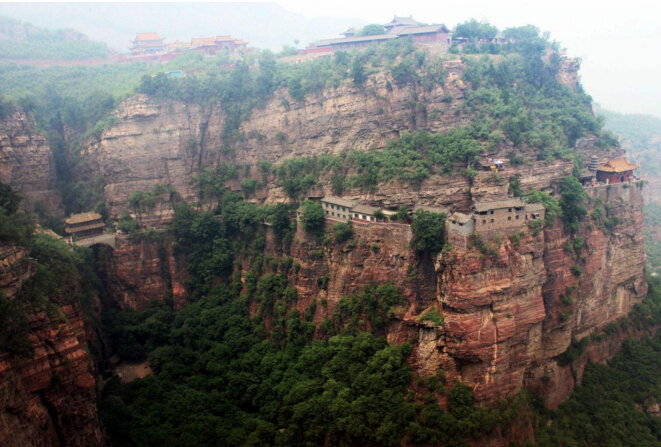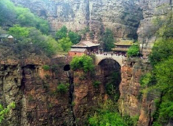 一絕“橋樓殿”。橋凌駕于百仞峭壁之間,仰視藍(lán)天一線,俯首萬丈深淵。形制如同趙州橋敞肩拱式。橋上建樓,云飛樓動(dòng),樓內(nèi)建殿,殿內(nèi)三尊大佛。真是“千丈虹橋望入微,天光云彩共樓飛”,不是仙境勝似仙境,疑是天堂落塵?!,F(xiàn)為中國三大懸空寺之一。