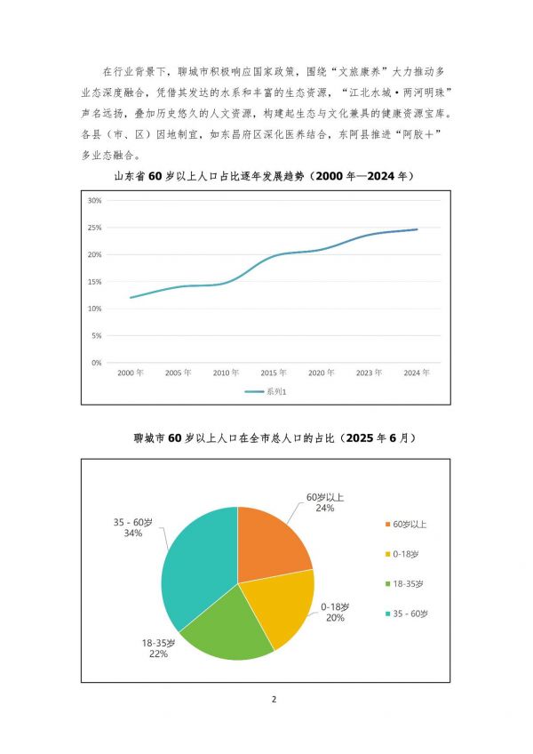 黨的二十大以來“健康中國”戰(zhàn)略全面實(shí)施。2024年山東省65歲以上老齡人口占比達(dá)17.73%(高于全國15.6%),國家相繼印發(fā)《“十四五”健康老齡化規(guī)劃》《“十四五”國民健康規(guī)劃》。山東省印發(fā)了《山東省醫(yī)養(yǎng)健康產(chǎn)業(yè)發(fā)展規(guī)劃(2023-2027)》,聊城市也隨之發(fā)布了《聊城市大健康產(chǎn)業(yè)發(fā)展規(guī)劃(2024—2028年)》等政策文件,關(guān)于健康的政策紅利持續(xù)釋放。隨著“健康中國2030”戰(zhàn)略推進(jìn)和老齡化加劇,康養(yǎng)旅游作為新興融合業(yè)態(tài),已成為區(qū)域經(jīng)濟(jì)轉(zhuǎn)型的重要?jiǎng)恿?,國家《“十四五”旅游業(yè)發(fā)展規(guī)劃》明確指出支持特色康養(yǎng)旅游發(fā)展。