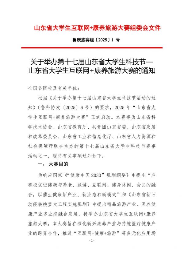 根據(jù)《關(guān)于舉辦第十七屆山東省大學(xué)生科技節(jié)活動的通知》(魯科協(xié)發(fā)〔2025〕6 號)的要求,2025 年“山東省大學(xué)生互聯(lián)網(wǎng)+康養(yǎng)旅游大賽”正式啟動。本賽事為山東省科學(xué)技術(shù)協(xié)會、山東省教育廳、共青團(tuán)山東省委、山東省發(fā)展和改革委員會、山東省工業(yè)和信息化廳、山東省人力資源和社會保障廳聯(lián)合主辦的第十七屆山東省大學(xué)生科技節(jié)賽事 活動之一,現(xiàn)將有關(guān)事項通知如下: