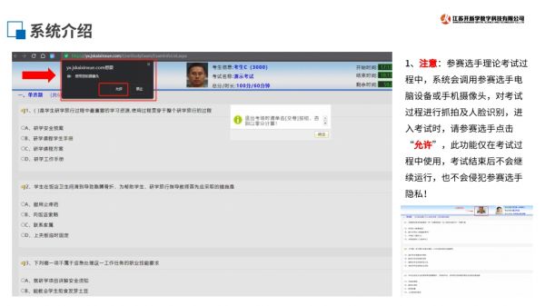 考試過程中系統(tǒng)會調(diào)用選手電腦或手機(jī)攝像頭,進(jìn)入考試時(shí)請點(diǎn)擊“允許”,考試結(jié)束后系統(tǒng)將不會繼續(xù)監(jiān)控。