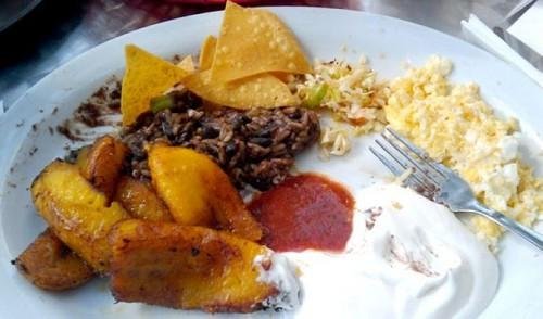 2.Platos Típicos 是薩爾瓦多一道典型的早餐,由薩爾瓦多標(biāo)志性的食物構(gòu)成,其中包括炸甜大蕉、casamiento(洋蔥汁拌黑豆米飯)和薩爾薩。