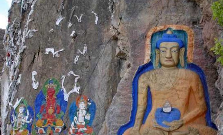 度母神廟往東不遠(yuǎn),有著名的摩崖石刻聶當(dāng)大佛,這是中外觀光者進(jìn)入拉薩前的一大景觀,幾乎所有的人都要下車(chē)瞻仰度母神廟,并在聶當(dāng)大佛前留影。