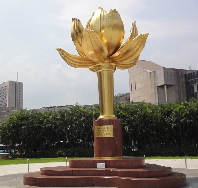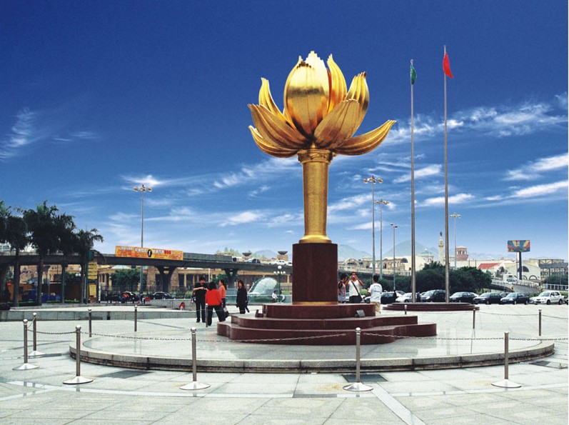主體部分由花莖、花瓣和花芯組成,青銅鑄造,表面貼金裝飾,形似蓮葉的基座部分則由二十三塊紅色花崗巖相疊組成,寓意澳門三島。蓮花是澳門特別行政區(qū)區(qū)花,蓮花盛開、亭亭玉立、冉冉升騰,象征澳門永遠(yuǎn)繁榮昌盛。