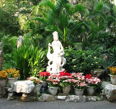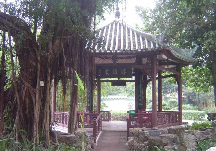從正門進入公園,是一座書有“屏山鏡樓”四個大字的古色古香的圓形拱門,兩旁是長滿鮮花和翠竹的林蔭小道,參天的榕樹、成片的竹林、盛開的鮮花掩映著樓臺亭閣、曲徑回廊、池塘橋榭、流水飛瀑 、假山怪石。園內景點分布得當,景色錯落有致。假山堆成的奇峰怪石玲瓏剔透、崢嶸百態(tài),涓涓流水從假山頂部跌落 ,形成五疊瀑布,水流又注入假山腳下的小池塘,一位用巨石壘成的古代美女玉立池中,池邊垂柳依依,池內水明如鏡,白蓮搖曳,成群的非洲鯽魚游來游去,圓圓的荷葉和橫跨其上呈弧狀彎曲的九曲橋相映成趣。