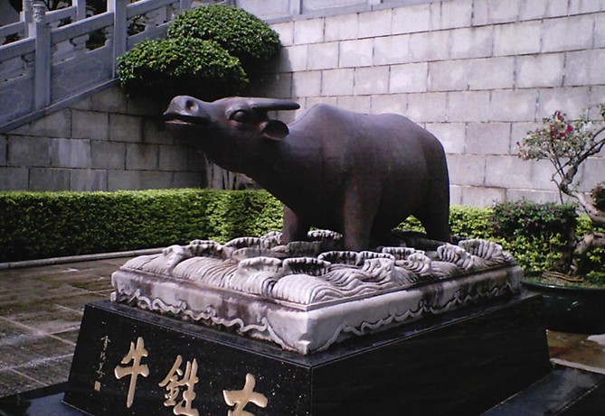 入口是一座聳立的大石牌坊,三門歇山頂建筑,高16米,氣勢恢宏磅礴,正中題“東粵菁華”,兩側(cè)分別書有“金聲”“玉振”,皆是國學大師饒宗頤先生的手跡。牌坊到正殿是三進石階,院內(nèi)花圃簇擁著石雕的麒麟、青獅、盤龍及鐵牛等吉祥物。