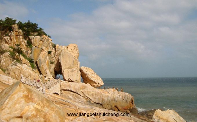 沿著濱海巖石鑿出的一條石徑前行,過了一座石橋,前邊便是“飛戟洞”和“斧劈崖”,幾乎都與媽祖的傳說緊密相連。相傳早年,湄洲灣海域有一條鯉魚多年修煉成精,時常出沒作祟,為害漁民。百姓苦不堪言,只好求助于媽祖。媽祖勸鯉魚精棄惡從善,改邪歸正。鯉魚精不聽,繼續(xù)一意孤行。媽祖派龍?zhí)忧叭ナ辗?。龍?zhí)优c鯉魚精交手沒幾個回合就敗下陣來。媽祖左右將千里眼和順風(fēng)耳看在眼里,急在心里。千里眼揮起斧頭猛力從云中砍下去,鯉魚精沒有傷著,卻把這海巖齊刷刷地切開,成了“斧劈崖”;順風(fēng)耳操起方天戟扎下去,扎出一個洞,就是“飛戟洞”。龍?zhí)?、千里眼、順風(fēng)耳以三戰(zhàn)一,仍難以取勝。媽祖只好召雷公來助戰(zhàn)。雷公看到“三戰(zhàn)一”斗得正酣,便瞄準(zhǔn)鯉魚精的要害,一錘子打下去,便把鯉魚精打趴在地,成了“鯉魚十八節(jié)”景點。從“霧海尋燈”亭出來,到“讀海臺”,最后來到“龍洞聽潮”。如果是夏天,這里可是納涼的好地方,即使是炎炎酷日,這里也是清沁涼爽。坐下來歇息,聽海浪輕輕拍打礁石的聲音,令人心曠神怡。順著石階下去,又是一個人間仙境,仿佛與喧囂的塵世驀然隔絕。抬頭東望,眼前豁然開朗,大海煙波浩淼,一望無垠。如果是秋冬季節(jié),又恰逢滿潮時分,那狂風(fēng)巨浪拍擊巖的轟鳴聲,那此起彼伏的涌浪瀑出的浪花,激起的泡沫,讓懦弱者膽戰(zhàn)心驚,讓勇敢者激情奔放、壯志滿懷。人們在這里都會充分感受到大自然的神奇莫測,大海的千變?nèi)f化。再高明的藝術(shù)家面對大海的變幻也會感到藝術(shù)手段的貧乏和無奈。