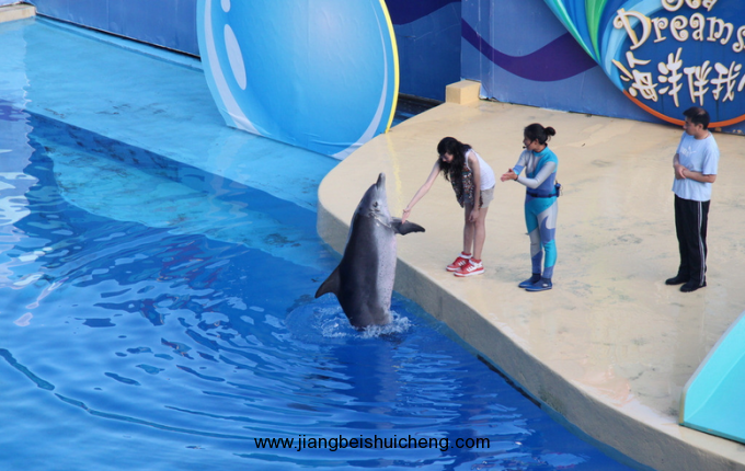 重頭戲——海洋劇場3:30開幕。前來觀看的游客一般會非常多,盡量提前半小時去,能坐陽光爆曬的座位。節(jié)目內(nèi)容很多,兩只海獅招手、倒立、揮手、拿救生圈救人、對“落水者”進(jìn)行人工呼吸……不知道與海獅kiss是啥味道。五只海豚則表演游泳比賽、跳高觸球、跨藍(lán)、空中翻身36周半、直立旋轉(zhuǎn)、仰泳等,真的是很有靈性。最讓我驚嘆的是那些團(tuán)體動作,竟也能做得那樣整齊劃一,有板有眼。
