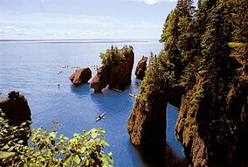 新不倫瑞克省的南部森林逐漸稀疏,向沿海地貌過渡,該省最主要河流圣約翰河在芬迪灣注入大西洋。芬迪灣(Fundy Coast)以不同尋常的潮汐聞名于世,它位于新不倫瑞克省與新斯科舍省之間,與大陸海岸線成平行方向,縱深290公里。芬迪灣的海潮是世界上最高的,平均高度為 10 米,最高可達 17 米,強勁的浪濤,不僅每十二小時帶來1000億噸海水(這比全球所有淡水河流中每天流動的水量還要多),更以數(shù)世紀的旱雕砌成舉世聞名的“花盆巖”景觀。