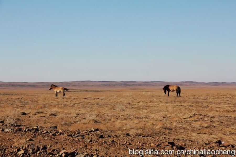 遙望遠(yuǎn)處,兩匹野馬在一望無垠的曠野上悠閑的吃草···國(guó)寶?。?br />
